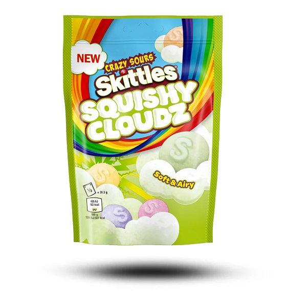 Erlebe den fruchtig-sauren Spaß mit Skittles Squishy Cloudz Crazy Sours 94 g – superweiche Schaumzucker-Süßigkeiten in aufregend sauren Geschmacksrichtungen. Perfekt für alle, die es bunt, fluffig und spritzig lieben!
